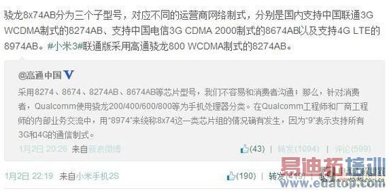 前两天小米3联通版“换芯”事件可以说闹得沸沸扬扬,事件起因就是随着小米3联通版的发售,人们渐渐发现其官方宣称的“高通骁龙MSM8974AB处理器”被换成了“高通骁龙MSM8274AB处理器”。
