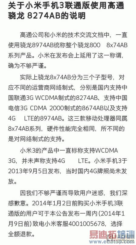 所以在压力之下,小米官网随即宣称“凡是2014年1月2日前购买的联通版小米3,并在1月9日前进行联系的用户,均可全额退款”