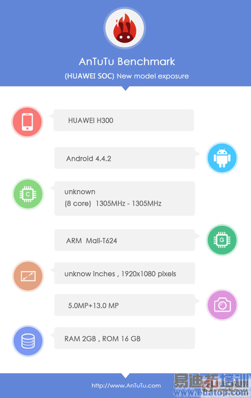 安兔兔数据库中出现了一款型号为HUAWEI H300的测试机型,采用的是型号未知的八核芯片,主频为1.3GHz,搭载Mali T624 GPU,这会不会是早前曝光的还是Kirin 920八核处理器?