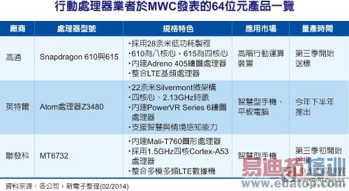 64位元行动处理器市场火药味愈来愈浓。继苹果(Apple)、辉达(NVIDIA)之后,高通(Qualcomm)、英特尔(Intel)与联发科也不约而同在今年全球行动通讯大会(MWC)上,大秀64位元行动处理器,并将于下半年开始陆续送样,预计最快今年底终端产品即可问世。此一发展不仅宣告64位元行动处理器争霸战正式开打,亦可望加速行动装置迈入64位元新世代。