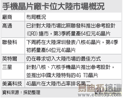 三星加入智能型手机芯片战局,宣布推出两款分别为八核与六核的手机芯片参考方案(即公板),并推出4G TD-LTE芯片,与联发科、高通、美满科技(Marvell)等竞逐中国大陆市场。