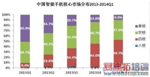 在智能手机市场,四核手机的份额较去年同期的9.4% 有了快速增长,到2014年一季度已占据了49.7%的市场份额,远高于全球35.6%的平均水平。这主要是因为中国市场已是各芯片厂商的必争之地,市场竞争非常激烈,产品更新换代速度加快,并且在OEM的宣传下中国消费者对成熟的四核手机认可度较高。以上诸因素使得四核产品得到快速普及。