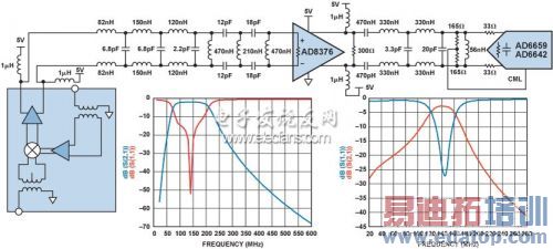 AD5356在200 Ω负载下具有最佳性能,而AD8376的输入阻抗为150 Ω。因此,为了抑制混频器输出杂散并提供良好的阻抗匹配,差分LC滤波器必须具有200 Ω的输入阻抗和150 Ω的输出阻抗。在某些应用中,需要通过过渡带极窄滤波器抑制频带外信号,可使用差分SAW滤波器来实现,但这会给接收机信号链引入过大的损耗和群延迟。四阶差分带通巴特沃兹滤波器可适合许多无线接收机,因为前端RF滤波器可以为带外干扰提供足够的衰减。