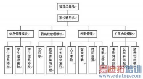 该家校通系统,包含四个管理模块:信息管理模块,到离校管理模块,考勤管理和异常报警模块。本系统主要阐述到离校管理模块,也是家校通的核心功能,典型的RFID技术利用,实现学生的平安情况汇报。具体功能模块图如下图2所示: