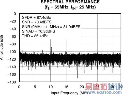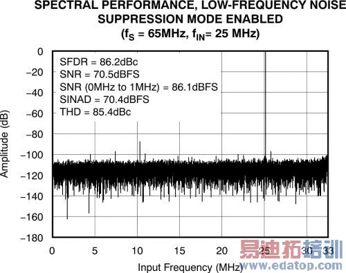 根据奈奎斯特 (32.5MHz) 测得 65MSPS 下 ADS5282 的 SNR 为 70.4dBFS。如果假设噪声底限较奈奎斯特扁平,那么 0-1MHz 频带中的噪声功率则为 85.5dBFS,这主要是由于 15.1dB 的处理增益:10log10 (32.5M/1M)。利用能够过滤高达 1MHz 的信号和噪声的理想滤波器,85.5dBFS 就为数字滤波器输出的预期 SNR。但是,1MHz 频带中测得的 SNR 为 81.9dBFS,因为基带上存在 1/f 噪声。一旦噪声抑制模式被激活,该频带中测得的 SNR 便提高到 86.1dBFS。1MHz 带宽中测量值(86.1dBFS)超出预期值(70.4+15.1=85.5dBFS)的这一事实具有误导性,因为它是由一个标准奈奎斯特 SNR(70.4dBFS)计算得到的,而该奈奎斯特SNR 包括了高阶谐波(第九阶以上),其被当作了噪声。这表明,真正的奈奎斯特 SNR(所有谐波除外)实际上高于 0.6dB,或为 71dBFS。