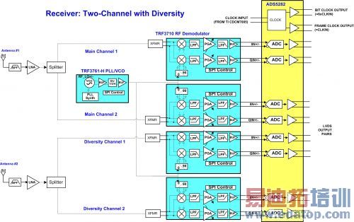 但是,高度集成的 ZIF 接收机(例如:TI 推出的 TRF3710)可以最小化路径不匹配问题。I 和 Q 模拟路径现在均位于同一颗芯片上。这些路径会得到非常好的匹配,因为它们之间几乎不存在工艺、温度或电压差异。该器件包含了一个复杂的混频器、一个 24dB 可编程增益放大器 (PGA)、一个可编程八阶低通抗混淆 ADC 输入滤波器,以及一个直接连至双通道 ADC 的驱动放大器。此外,它还包含了一个 DC 偏移校正模块,对于最小化模拟输出的 DC 偏移分量极为有用。集成所有这些必需功能后,对于用户而言,ZIF 架构变得简单。I 和 Q 路径得到了匹配,同时保持了较好的 EVM。通过将信号链的大部分集成到一个小封装中,便可以在不牺牲板级空间或性能的情况下使用分集接收路径。