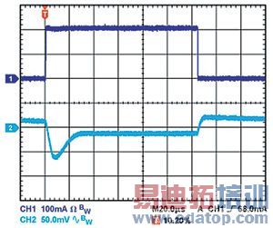 输出电容还会影响调节器对负载电流变化的响应。控制环路的大信号带宽有限,因此输出电容必须提供快速瞬变所需的大多数负载电流。当负载电流以500mA/μs的速率从1mA变为200mA时,1μF电容无法提供足够的电流,因而产生大约80mV的负载瞬态,如图1所示。当电容增加到10μF时,负载瞬态会降至约70mV,如图2所示。当输出电容再次增加并达到20μF时,调节器控制环路可进行跟踪,主动降低负载瞬态,如图3所示。这些示例都采用线性调节器ADP151,其输入和输出电压分别为5V和3.3V。