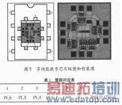 图5所示为一款多功能数字芯片的版图照片和封装示意图,表1为管脚对应图