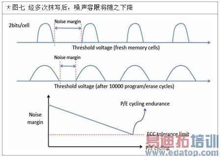 在SSD上的状况时,SSD会随着使用抹写次数(P/E Cycle)的增加,而使得其噪声容限(Noise Margin)随之降低,就如图七所示,经过一万次的抹写使用后,噪声容限就产生了明显的恶化,而更容易受到触控面板或其它噪声源的干扰,而影响实际功能。在这个情境下,若能作到SSD的均匀抹写,便是有效缓和噪声容限下降速率的方法之一。