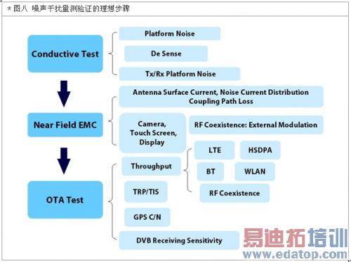 在验证初始必须先透过传导测试,精确量测出装置本身的载台噪声、接收感度恶化情形、以及传送与接受(Tx/Rx)时的载台噪声。