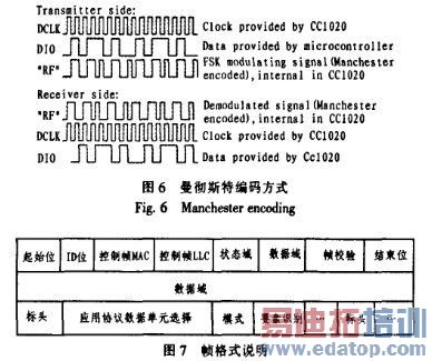 1)物理层 物理层主要是通信信遭标准,由于目前国际上尚未形成关于433 MHz短距离无线通讯统一的标准,各种标准定义的物理层也不尽相同,如表1所示。图6为曼彻斯特编码方式。