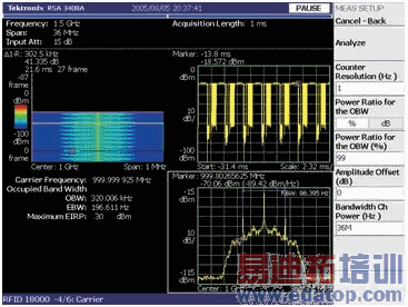 政府规定要求控制发射信号的功率、频率、带宽。这些规定防止有害干扰并保证每个发射者都是频带内其他用户的友好邻居。对于许多频谱分析仪特别是通常用于脉冲信号能量测量的扫频频谱分析仪,进行此类测量是具有挑战性的。RTSA 能够分析一个完整的分组发射过程的能量特点,也能直接测量跳频信号的载波频率,而无需将信号置于一个跨度的中心。按一下按键,分析仪就能识别一个瞬时 RFID 信号的调制方式并能够对功率、频率和带宽进行监管测量,使预一致性(pre-compliance)测试过程变得非常灵活和方便 [参阅图2]。预一致性测试有助于确保产品一次通过一致性测试,而无需重新设计和重新测试。