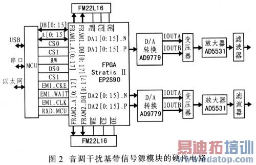 根据以上干扰样式的要求,权衡考虑可使用FPGA+D/A转换器的硬件平台实现,采用多套基带电路板配合不同的混频器、功放以及前端天线实现对通信频段的广谱干扰,音调干扰基带信号源模块的硬件电路如图2所示。