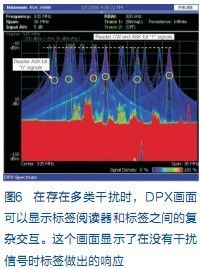 在进行频率规划,把每个阅读器限定在某条通道(或多条通道)时,可以使用DPX保证调制边带的电平不会在并放阅读器使用的通道中产生干扰。注意图6中心的阅读器和标签信号拥有宽频谱展宽,驻留时间要长于其它通道。较亮的信号边缘表明信号密度较高,因此驻留时间较长。这可能会导致邻道读取失败,应采取措施,保证阅读器中的滤波功能足以抗击这种干扰。
