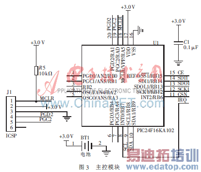 主控模块采用Microchip公司型号为PIC24F16KA102的16 bit超低功耗单片机。该系列的MCU采用nanoWatt XLP(eXtreme Low Power)极低功耗技术,其典型休眠电流可以低至20 nA,实时时钟电流低至490 nA,看门狗定时器电流低至370 nA[3]。MCU可连续运行20年以上而无需更换电池,成为业界8 bit和16 bit MCU中低功耗性能最突出的MCU。该单片机具有SPI、I2C、UART、9个模拟输入通道、3个16 bit定时器/计数器、3个外部中断[3],完全可以满足有源标签的需求。MCU与标签通过SPI接口进行串行通信,如图3所示。图3中的J1是PIC 24F16KA102单片机用于下载和调试程序所用的ICSP接口。