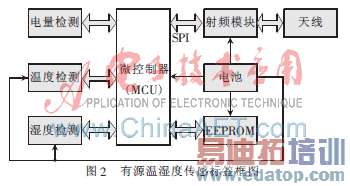 本文所设计的有源温湿度传感标签的结构框图如图2所示。有源标签的核心是一个微控制器(MCU),射频模块通过天线进行射频信号的收/发;EEPROM 存储标签的身份识别码以及物品的属性等信息;温度检测和湿度检测分别用来检测标签所处环境的温度和湿度,为简化设计,可以使用集温湿度检测于一体的芯片;电量检测模块通过检测电池的电压,并根据电池电量和电压的对照关系,间接地检测出电池的剩余电量;电池为各个模块的正常工作提供电源。