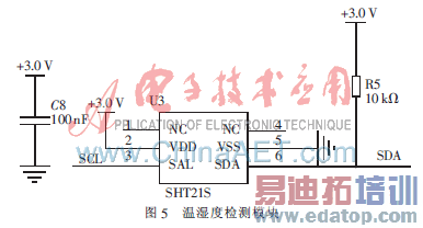 SHT21S[5]是瑞士Sensirion公司的温湿度传感器,体积小、功耗低、稳定性好。该温湿度传感器在25℃时的温度测量精度为±0.3℃,温度响应时间为5 s~30 s(τ63%);湿度测量精度为±2.0% RH,湿度响应时间为8 s(τ63%)。该芯片通过SDM接口与MCU进行通信。温湿度的测量通过SCL(3脚)来选择,当SCL输入高电平时进行湿度的测量;SCL为低电平时进行温度的测量。也可以在SDA引脚外接一个低通RC滤波器将SDM信号转换为模拟电压输出。温湿度检测模块如图5所示。