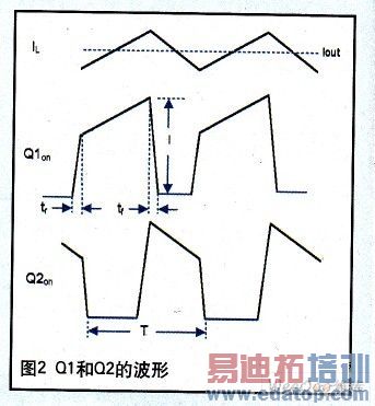 当Q1关断、Q2导通时,就形成了第二个回路。之后存储在L1内的能量流经输出电容器和Q2,如图5所示。这些回路面积控制对于降低电磁干扰是很重要的,在PCB走线布线时就要预先考虑清器件的布局问题。当然,回路面积能做到多小也是有实际限制的。