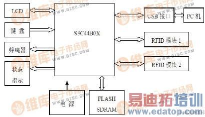 整个系统由ARM 嵌入式系统(包括S3C44B0X,SDRAM 存储器和FLASH 存储器),低频RFID 卡读写模块,高频RFID 卡读写模块,USB 接口,LCD 显示器以及蜂鸣器、状态指示灯等组成。RFID 模块是北京华闰得公司开发的具有串行数据通信接口的模块,低频读写模块是 CR001,为工作于125kHz 的EM4001 卡;高频模块是CR013,为工作于13.56MHz的MF 卡。由于RFID 模块具有TTL 电平的串行通信接口,这样ARM 微处理器可直接通过片上的二个UART 接口与其连接,不需要电平转换即可轻松实现与RFID 模块的通信。嵌入式系统与 PC 机的连接则通过USB 接口实现。