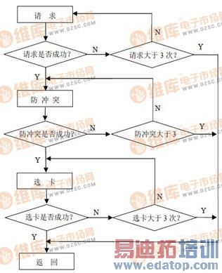 整个寻卡过程包括请求、防冲突、选卡三个步骤。当微处理器发出寻卡命令时,实际上微处理器执行了以上3 个步骤。为防止死锁,本文设置每步操作的最大次数为3 次,若3次不成功则寻卡失败。程序流程如图3 所示。