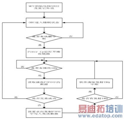 实际应用BK5822实现的OBU,在程序初始化后,一般来说,只是通过两个中断信号触发 MCU之后,才与BK5822进行数据传输。一个中断信号为唤醒中断,另一个为IRQ中断。IRQ的中断信号在接收到数据或发射完数据后产生。具体MCU 和BK5822的交互流程图如图4所示。