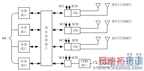 信号覆盖方式上,RRU可通过同频不同扰码方式,从NodeB引出。也可通过同频不同扰码方式,从RNC引出。着两种覆盖方式都是常规的方式,这里介绍另外一种覆盖方式:基站有3个扇区,配有多余的信道板以及多余基带处理设备就可以利用基带池共享技术,将多余的基带处理设备设为第4小区,如图3所示。图中SC为扰码 I/Q射频调制解调,SCH为同步码。