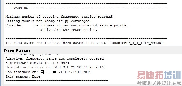 但是仿真结果中提示,频率范围无法完全覆盖,如图2所示。建议我增加采样点(“increasing maximum number of sample points”),或者激活复用选择(“activating the reuse option”)。