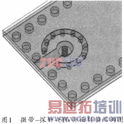 为使能量更好的通过探针进入SIW,可在上层基板探针周围设计一种包围它的金属柱,并适度调节该转换结构的各参数值,以最终得到图1所示的微带-探针-SIW异面转换的结构图。