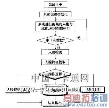 当系统上电启动后,首先对系统进行初始化。初始化完成后,系统进行视频图像的采集和回放,GIO/FVID(项层类驱动)控制TVP5150通过EDMA 将视频数据YCbCr(4:2:2)传递到视频输入任务请求的缓冲I~capFrameBuf中。当系统接收到串El中断信号后,视频处理任务通过 SCOM通讯从capFrameBuf中将数据取走,进行人脸检测、特征提取和人脸识别等一系列操作,并将结果输出。