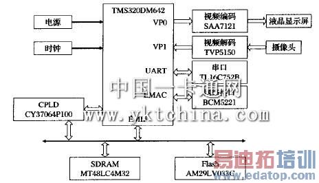 本系统基于TI公司的TMS320DM642设计硬件平台,因为DM642有丰富的外部设备接口,完全能够满足门禁系统的需要。DM642通过外部存储器接口(EMIF)访问片外存储器SDRAM和FLASH。SDRAM为4M x 64位的同步动态存储器接口,用于存储程序、数据和图像处理中间结果,配置在EMIF接口的CE0空间;FL ASH为4M x8位的异步静态存储器接口,用来存储人脸的模板特征、固化程序、导入装载和配置信息,配置在DM642的EMIF的CE1子空间。此外,CE1子空问还分配给状态/控制寄存器、UART等资源使用。因此,Flash的最大的可寻址范围为512K x 8位。为了访问到Flash的所有地址空间,本系统采用分页技术来实现对Flash的访问,即将整个4M x 8位的Flash分成8个512×8位的页,而页地址则由位于CPLD中的页地址寄存器提供。选用TVP5150视频解码芯片,通过I2C可编程总线进行控制,采用8位并行总线实现数据的传输。