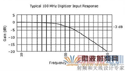 带宽形容一个频率范围,在这个范围内,输入信号可以用振幅损失最少的方式,穿过模拟前端──从探测器的前端或测试设备到达 ADC 的输入端。带宽指定为正弦曲线输入信号衰减至原振幅之 70.7% 时的频率,亦称为 -3 dB 点。下图说明 100 MHz 高速数字器的典型输入反应。