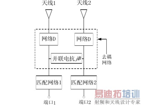 第一步,由于初始天线阻抗匹配良好,而天线之间却存在强烈的耦合。因此网络D的功能是将两个端口之间的传输导纳从复数变为纯虚数。