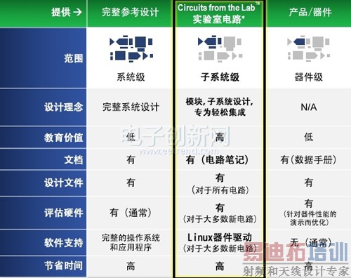 可以看出,ADI的实验室电路已经不是简单的一个电路,而是试图通过文档打包的形式把ADI的模拟经验进行复用和传承。它更像一个可以移植的子系统,下面这个图表揭示了ADI实验室电路和参考设计以及器件的区别。