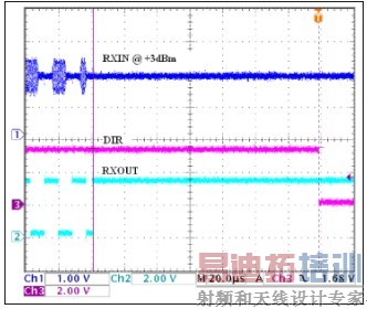 图8.RXOUT解调数据输出最后一位之后,经过16个位时钟周期释放MAX9947的方向控制输出(DIR)。数据速率为115.2kbps。