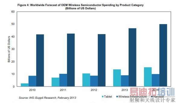 IHS iSuppli公司估计,在无线半导体支出最多的20家OEM厂商中,市场领导厂商苹果与三星电子的年度增长率会很高。另一家值得关注的厂商是LG电子,其无线支出将大幅增长。该市场包含快速成长的中国厂商,华为、中兴通讯与联想等也将引人注目。
