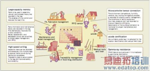 RFID起初被用作可由RFID阅读器读取的ID存储。富士通半导体将FRAM用在了RFID,由于FRAM擦写速度快、耐擦写次数高,因而实现了大容量存储的数据载体标签。如今,内置串行接口的RFID增加了一项新功能,即使标签不在RF区域,也可通过MCU从传感器等设备上记录可追溯数据,并可在日后通过RF读取数据。