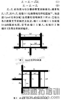 在微波电路中,功率分配/合成器是非常重要的器件,它广泛应用于馈线系统、混频及功率放大器中。Gysel功率分配/合成器由Ulrich H.Gysel于1975年提出,其拓扑结构介于分支线耦合器结构和威尔金森结构之间,与分支线耦合器一样,其终端负载可以通过一段任意长度,且特性阻抗与负载阻抗相同的传输线引到电路上的任意位置,因而负载可以根据需要外接在电路上,便于大功率负载的使用;同时具有和威尔金森功率分配/合成器一样的相对带宽。此外,Gysel功率分配/合成器可以采用同轴线、带状线、空气板线及微带线等多种形式实现。但是,Gysel功率分配/合成器也存在一些缺点:首先,Gysel形式在20%相对带宽情况下,其插入损耗、驻波等指标比威尔金森形式要好,显示出较好的宽带特性。但窄带情况下,当传输线损耗相同时,Gysel形式的损耗值约为0.12 dB,威尔金森则为0.1 dB,驻波也稍大一些。其次,在输入输出端口回波损耗小于-20 dB的原则下,Gysel功率分配/合成器的相对带宽为20%左右,在一些宽频带应用的场合,Gysel功率分配/合成器的带宽仍需要提高。另外,在设计 Gysel功率分配/合成器时,各个微带支节的阻抗值不是完全确定的,其中两个隔离电阻间的λ0/2微带线的阻值随带宽、隔离度等指标的要求变化,不利于设计和应用。