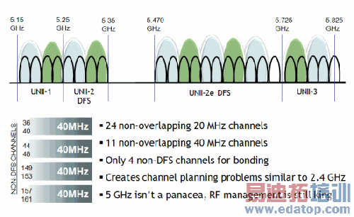 在使用最广泛的2.4GHz Wi-Fi频段,总共只有三个非干扰信道。即使是在5GHz频段,在去除动态频率选择(DFS)之后也只有4个非重叠40MHz宽信道,DFS是一种允许非授权设备与现有雷达系统共享频谱的机制。