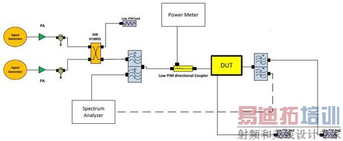 这里采用低PIM的50欧姆(Ω)端接来终止一个输出,并在第二个输出处混合讯号产生器所发出的两种频率(f1+f2)。使用低PIM的定向耦合器(通常为30dB的耦合)来测量待测装置输入中的功率,并且据此校准功率计来读取正确的值。