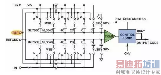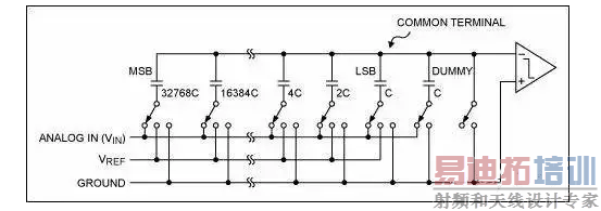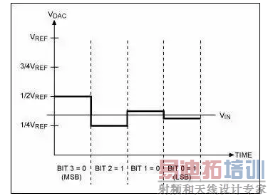 每个时钟沿,比较器对电容上的电压和地作比较, 由此结果来决定下一个电容是否接入电路。
