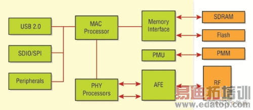 图1:移动WiMAX模块必须包含WiMAX基带PHY器件、MAC芯片、射频器件和功率放大器。