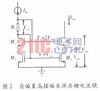 现在CPPLL通常采用无死区的PFD。这种PFD在锁相环锁定的情况下依然有等脉宽的UP和DOWN输出。这就要求电荷泵需要做到电流匹配。由于单一CMOS管实现的电流源的有限电阻,在不同的源漏电压下电流存在较大的变化。为了在1.8 V低压条件下实现较宽电压范围的恒定电流输出,本设计采用自偏置高摆幅共源共栅镜像电流镜,如图2所示。