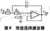 图8是简单的信道选择滤波器电路。其中运算放大器连接成单位增益,可以用源极跟随器实现,但为了降低引入闪烁噪声,源极跟随器应该使用大尺寸的晶体管。