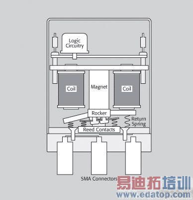 继电器内的容性是限制开关的信号频率的常见因素。继电器的材料和物理特性决定了其构成的内部电容。比如,在超过40GHz的射频和微波开关中,在机电继电器中采用了特殊的接触架构来获得更好的性能。图1显示了一个典型的构造,共同端接位于两个开关端接之间。所有信号的连接线路都是同轴线,来保证最佳的信号完整性(SI)。在这种情况下,连接器是SMA母头。对于更加复杂的开关结构,共同端接被各个开关端接以放射状围绕。