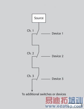 层叠开关架构是多位置开关的一种替代形式。它采用多个继电器将一个输入连接到多个输出。路径长度(同时决定了相位延迟)是由信号经过的继电器的数量决定的。