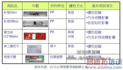 (1)此次验证主要针对化疗用针筒与装置针筒的红袋为主,测试多款RFID产品的读取率、厘清技术疑点,并测试针筒是否因含有液体,而可能干扰读取效果。因为化疗药物具腐蚀性,验证过程无法用实际药物,改以生理食盐水取代之。