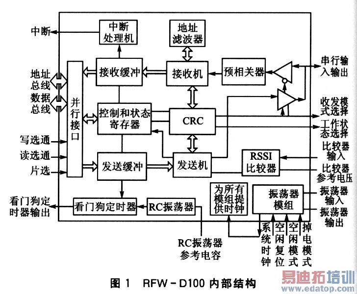 RFW—D100是为RFWl02/RFW302芯片组提供的一个数字后端。它为MCU提供了一个并行接口,使之连到RFWl02。在RF应用中,MCU负责MAC层的协议。RFW—D1OO减少MCU处理MAC层协议的实时要求。使MCU通过一个并行口连接到RFWl02,类似于存储器寻址,它将快速的串行输入转换成8位的字节,使8位的MCU更容易处理。此外,RFW—D1OO仅使用一个低速率的振荡器,通过1个16字节的FIFO来缓冲输入/输出,使MCU与RFW—D100之间的寻址效率更高。MCU不是每次中断读/写1个字节,而是每16个字节,相比于每字节的输入都引起一个中断。这样就明显减少了MCU在读输入字节时的开销。当使用FIFO时,MCU为所有FIFO的字节所付出的开销与没有用FIFO时仅为1个字节付出的开销是一样的。