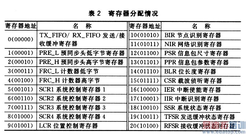 在MCU的软件编程中,开发人员实际要做的是对RFW—D100的各种寄存器进行正确的寻址、写入控制字、读/写数据等,参考文献[1]中有较详细的描述。寄存器分配情况如表2所列。