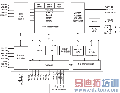 nRF9E5内嵌8051兼容微控制器、RF收发器和4通道10位A/D转换器,其功能结构如图1所示。