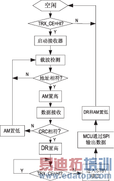 无线数据发送和接收的流程分别如图6和图7所示。图中TRX_CE为发送和接收使能寄存器位,DR为数据就绪寄存器位,AM为地址匹配寄存器位,AUTO_RETRAN为自动重发寄存器位。ShockBurst工作模式在前文已有介绍。